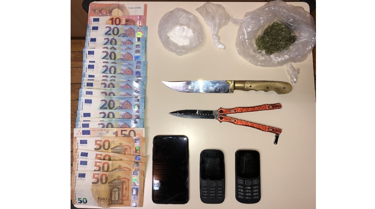 Κατά τη διάρκεια των ερευνών βρέθηκαν και κατασχέθηκαν συνολικά 21 γραμμάρια κοκαΐνης, 11 γραμμάρια κάνναβης, τρία κινητά τηλέφωνα 2 μαχαίρια και το χρηματικό πόσο των 700 ευρώ ως προερχόμενο από παράνομες δραστηριότητες .