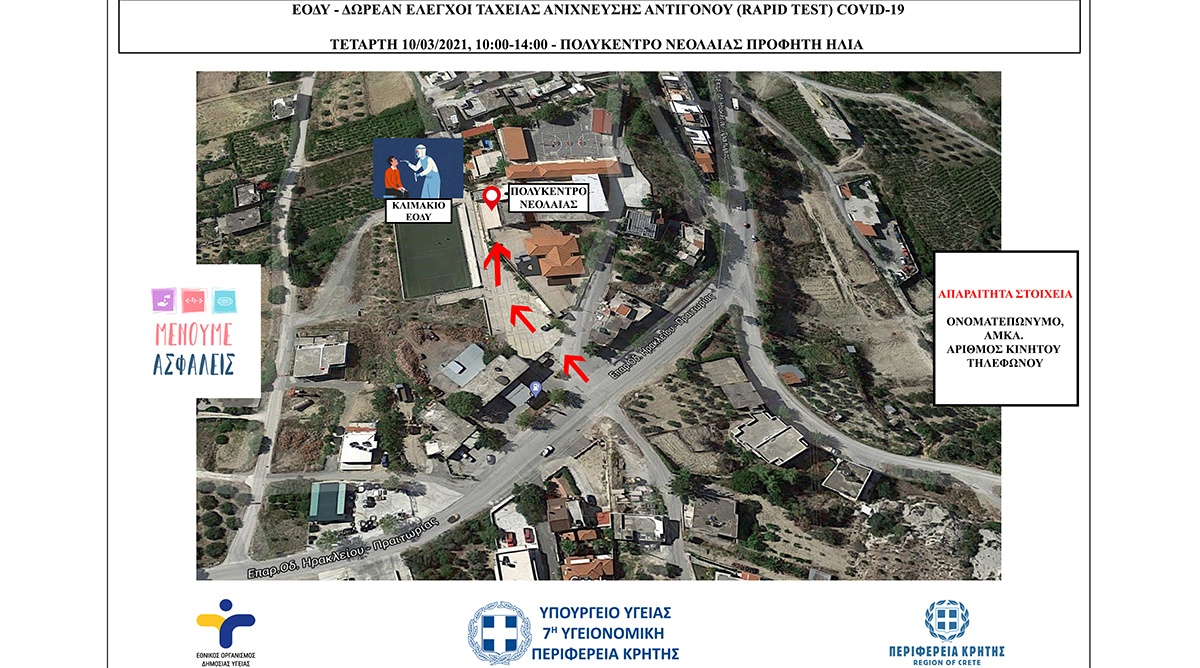 Έλεγχοι ταχείας ανίχνευσης αντιγόνου Covid-19 (rapid test) σε πεζούς, θα πραγματοποιηθούν τη Τετάρτη 10/03/2021 από κλιμάκια του ΕΟΔΥ στον Προφήτη Ηλία Ηρακλείου.