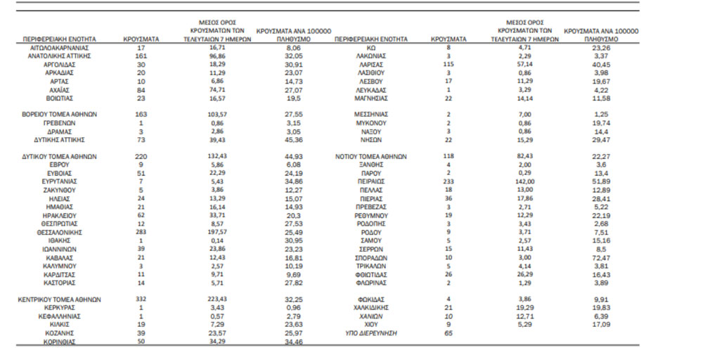 Τα νέα εργαστηριακά επιβεβαιωμένα κρούσματα της νόσου που καταγράφηκαν τις τελευταίες 24 ώρες είναι 2.633, εκ των οποίων 7 εντοπίστηκαν κατόπιν ελέγχων στις πύλες εισόδου της χώρας. Ο συνολικός αριθμός των κρουσμάτων ανέρχεται σε 212.091 (ημερήσια μεταβολή +1.3%), εκ των οποίων 51.6% άνδρες. Με βάση τα επιβεβαιωμένα κρούσματα των τελευταίων 7 ημερών, 69 θεωρούνται σχετιζόμενα με ταξίδι από το εξωτερικό και 2.312 είναι σχετιζόμενα με ήδη γνωστό κρούσμα.Tο R για την επικράτεια εκτιμάται σε1.06 (95% Crl: 0.43-1.81).