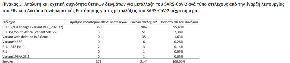 Από τα 371 δείγματα με στελέχη VOC, τα 368 βρέθηκαν με τη μετάλλαξη Β.1.1.7/UK lineage (Variant VOC_202012) και 3 δείγματα με τη μετάλλαξη Lineage B.1.351/South Africa (Variant 501.V2) (Πίνακας 3).