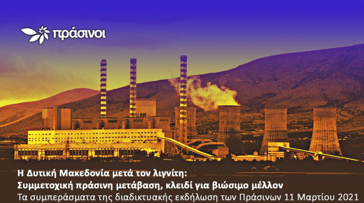 Μια Πράσινη Μετάβαση χωρίς καθόλου ορυκτά καύσιμα, διαφορετική από τις προτάσεις του κυβερνητικού σχεδίου και συνδιαμορφωμένη από την τοπική κοινωνία, μπορεί να προσφέρει σήμερα στη Δυτική Μακεδονία απαντήσεις και διεξόδους για ένα βιώσιμο μέλλον, με ευημερία για όλους και όλες. Αυτό ήταν το βασικό μήνυμα από την επιτυχημένη διαδικτυακή εκδήλωση της Θεματικής Ομάδας Οικονομίας του νέου κόμματος των Πράσινων, στις 11.3.2021, με θέμα «Η Δυτική Μακεδονία μετά τον λιγνίτη: υπάρχουν δρόμοι βιώσιμης ευημερίας για όλους και όλες;».