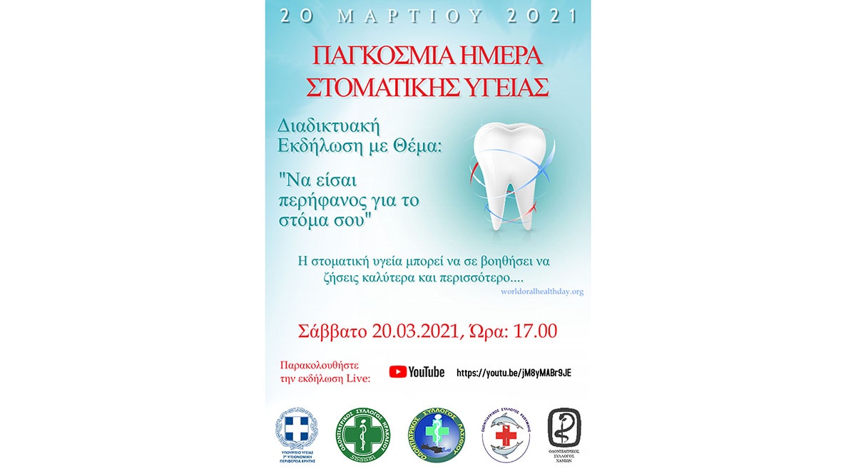 Με αφορμή την 20η Μαρτίου, Παγκόσμια Ημέρα Στοματικής Υγείας, η 7η Υγειονομική Περιφέρεια Κρήτης με την υποστήριξη των Οδοντιατρικών Συλλόγων Κρήτης διοργανώνει ανοιχτή διαδικτυακή εκδήλωση με θέμα: