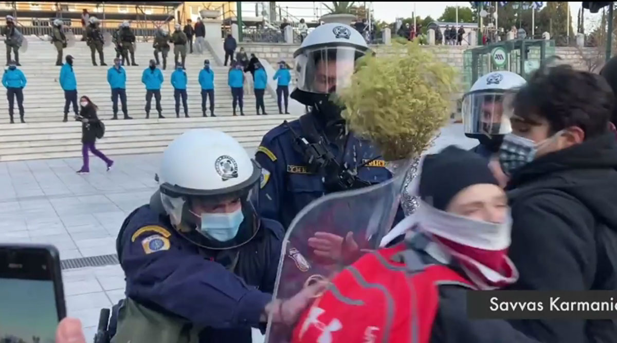 Όπως φαίνεται και σε βίντεο που κυκλοφορεί στα social media και δημοσιεύει η Αυγή, αστυνομικός τραμπουκίζει και απωθεί βίαια με την ασπίδα του κοπέλα που απλώς στεκόταν ακίνητη.