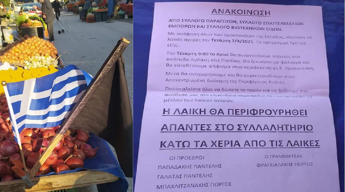 Επίσης, οι εκπρόσωποι των λαϊκών αγορών ενημέρωσαν τον κ. Βαρδάκη, ότι δεν θα λειτουργήσουν την Τετάρτη 7 Απριλίου καθώς προχωρούν σε κινητοποιήσεις και συλλαλητήρια συνεχίζοντας τον αγώνα, έως ότου καταλάβει η Κυβέρνηση ότι δεν μπορούν να παίζουν με την ίδια την επιβίωση τους.