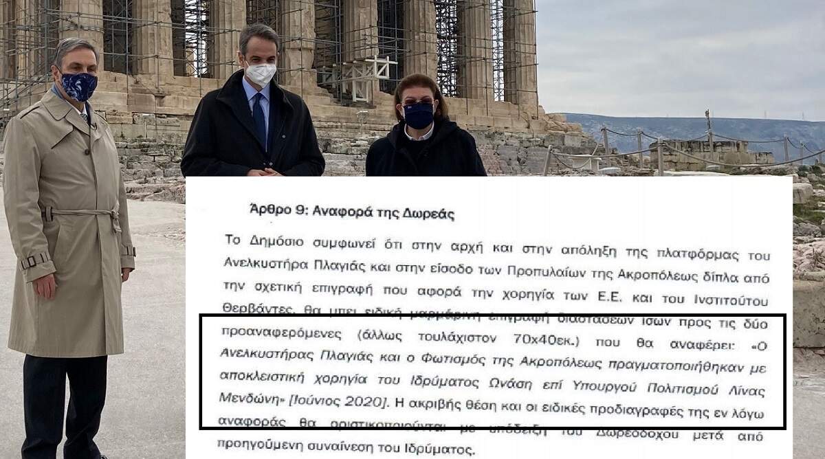 “Το Δημόσιο συμφωνεί ότι στην αρχή και την απόληξη της πλατφόρμας του ανελκυστήρα πλαγιάς και στην είσοδο των Προπυλαίων της Ακρόπολης, δίπλα από τη σχετική επιγραφή που αφορά τη χορηγία των Ε.Ε. και του Ινστιτούτου Θερβάντες, θα μπει ειδική μαρμάρινη επιγραφή διαστάσεων ίσων προς τις δύο προαναφερόμενες (άλλως τουλάχιστον 70Χ40 εκατ.), που θα αναφέρει: ‘Ο ανελκυστήρας πλαγιάς και ο φωτισμός της Ακροπόλεως πραγματοποιήθηκαν με αποκλειστική χορηγία του Ιδρύματος Ωνάση επί υπουργού Πολιτισμού Λίνας Μενδώνη’ (Ιούνιος 2020). Η ακριβής θέση και οι ειδικές προδιαγραφές της εν λόγω αναφοράς θα οριστικοποιούνται με υπόδειξη του δωρεοδόχου μετά από προηγούμενη συναίνεση του ιδρύματος”.