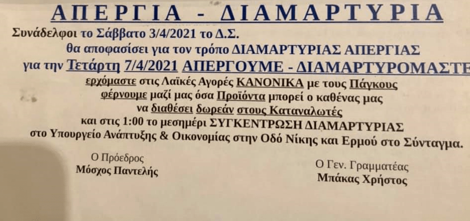 Στο Ηράκλειο πραγματοποιείται συγκέντρωση στο οικόπεδο Λυδάκη, όπου γίνονται οι λαϊκές της Πέμπτης και του Σαββάτου. Θα ακολουθήσει πορεία προς την Περιφέρεια Κρήτης και την Αποκεντρωμένη Διοίκηση.