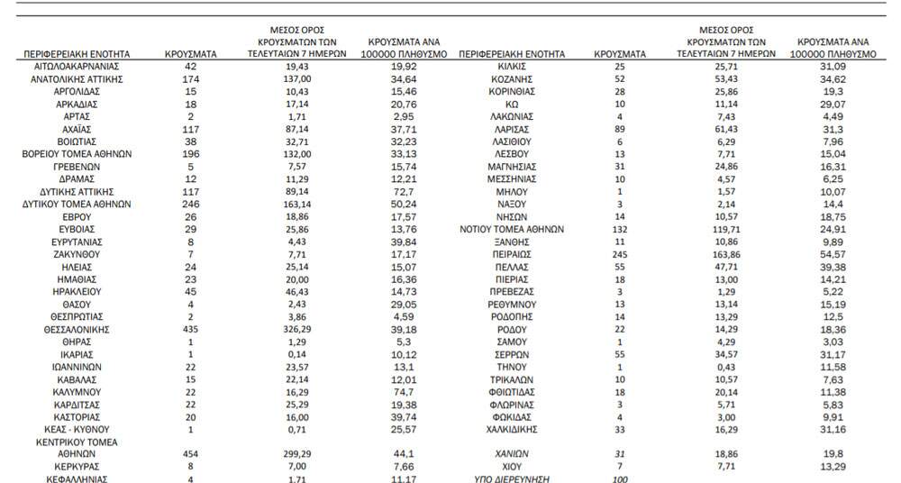 Τα νέα εργαστηριακά επιβεβαιωμένα κρούσματα της νόσου που καταγράφηκαν τις τελευταίες 24 ώρες είναι 3.228, εκ των οποίων 10 εντοπίστηκαν κατόπιν ελέγχων στις πύλες εισόδου της χώρας. Ο συνολικός αριθμός των κρουσμάτων ανέρχεται σε 288.230 (ημερήσια μεταβολή +1.1%), εκ των οποίων 51.4% άνδρες. 1 Με βάση τα επιβεβαιωμένα κρούσματα των τελευταίων 7 ημερών, 102 θεωρούνται σχετιζόμενα με ταξίδι από το εξωτερικό και 2.844 είναι σχετιζόμενα με ήδη γνωστό κρούσμα.