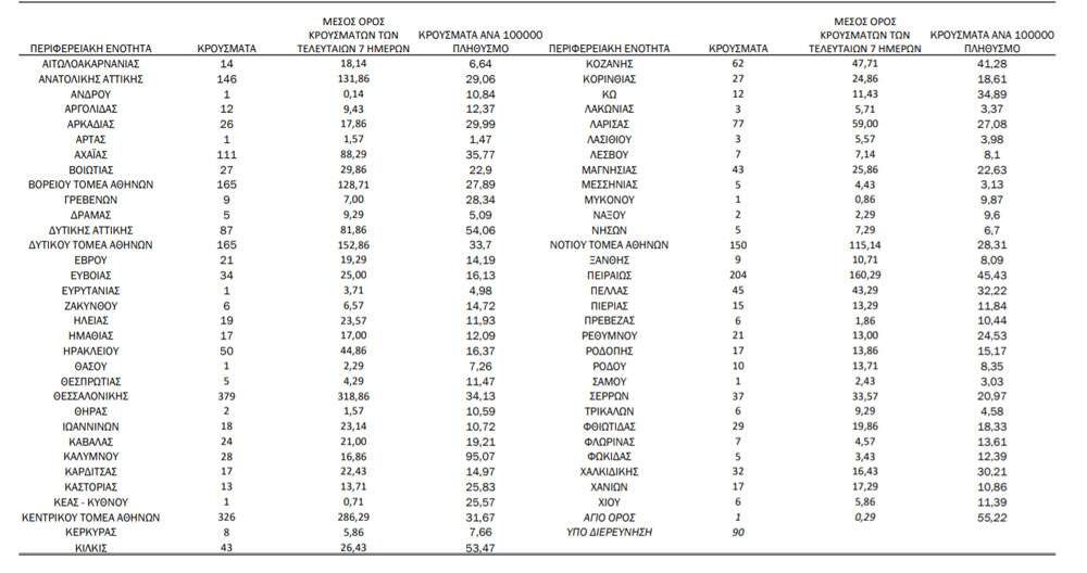 Με βάση τα επιβεβαιωμένα κρούσματα των τελευταίων 7 ημερών, 99 θεωρούνται σχετιζόμενα με ταξίδι από το εξωτερικό και 2.978 είναι σχετιζόμενα με ήδη γνωστό κρούσμα.