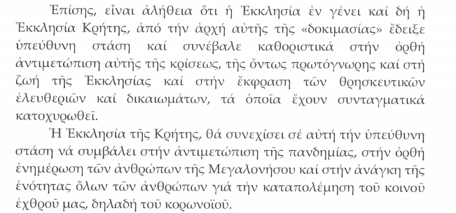 Επίσης, είναι αλήθεια ότι η Εκκλησία εν γένει και δη η Εκκλησία Κρήτης, από την αρχή αυτής της “δοκιμασίας” έδειξε υπεύθυνη στάση και συνέβαλε καθοριστικά στην ορθή αντιμετώπιση αυτής της κρίσεως, της όντως πρωτόγνωρης και στη ζωή της Εκκλησίας και στην έκφραση των θρησκευτικών ελευθεριών και δικαιωμάτων, τα οποία έχουν συνταγματικά κατοχυρωθεί.