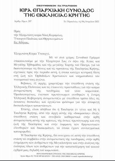 Με το άνα χείρας Συνοδικό Γράμμα επικοινωνούμε με την εξοχότητά σας ενόψει της Αγίας και Μεγάλης Εβδομάδος και της Μεγάλης Εορτής του Πάσχα, για να διατυπώσουμε τις θέσεις και τις προτάσεις της Εκκλησίας Κρήτης, σχετικώς προς την περίοδο αυτή, η οποία κατέχει κεντρική θέση στη ζωή των Ορθοδόξων Χριστιανών και νοηματοδοτεί τον πνευματικό τους αγώνα.