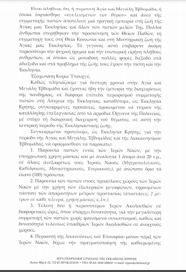 Στη συνέχεια, στην ίδια επιστολή προς την “εξοχότατη υπουργό”, κάνει λόγο για ιερές ακολουθίες εντός των Ιερών Ναών – με τήρηση όμως όλων των προβλεπόμενων μέτρων – και με αναλογία ενός ατόμου ανά 20 τ.μ. Επίσης, ζητά την τροποποίηση του ωραρίου απαγόρευσης το Μεγάλο Σάββατο στις 2 μετά τα μεσάνυχτα προκειμένου να μπορέσουν οι πιστοί να παρακολουθήσουν την Ανάσταση.