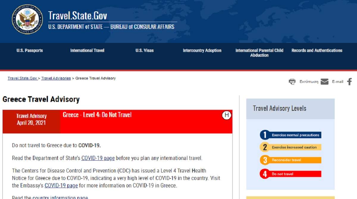 Ταξιδιωτική οδηγία, με την Ελλάδα στο επίπεδο κινδύνου 4 (μέγιστο) και την σύσταση “μην ταξιδέψετε”, εξέδωσε το State Department.