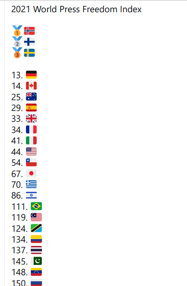 Η Ελλάδα είναι στην 70η θέση στη λίστα Ελευθερίας Τύπου, κάτω και από Μαλάουι, Μπουτάν και Μογγολία.