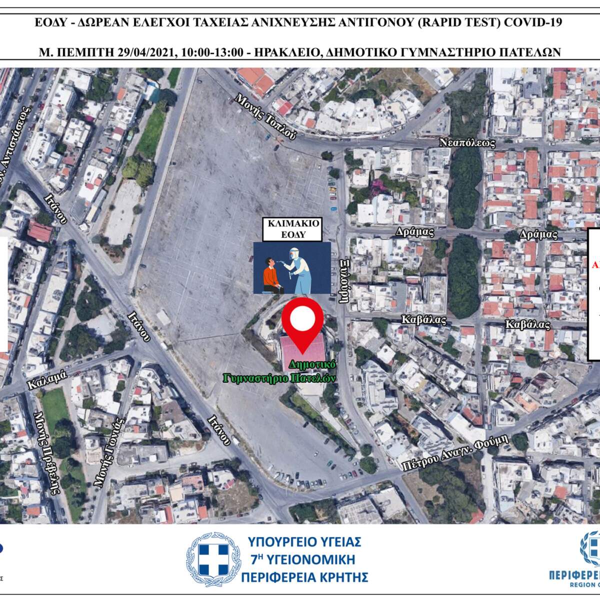 Έλεγχοι ταχείας ανίχνευσης αντιγόνου Covid-19 (rapid test) σε πεζούς θα πραγματοποιηθούν το Μ.Πέμπτη 29/04/2021 από κλιμάκια του ΕΟΔΥ στην περιοχή Πατέλες Ηρακλείου.