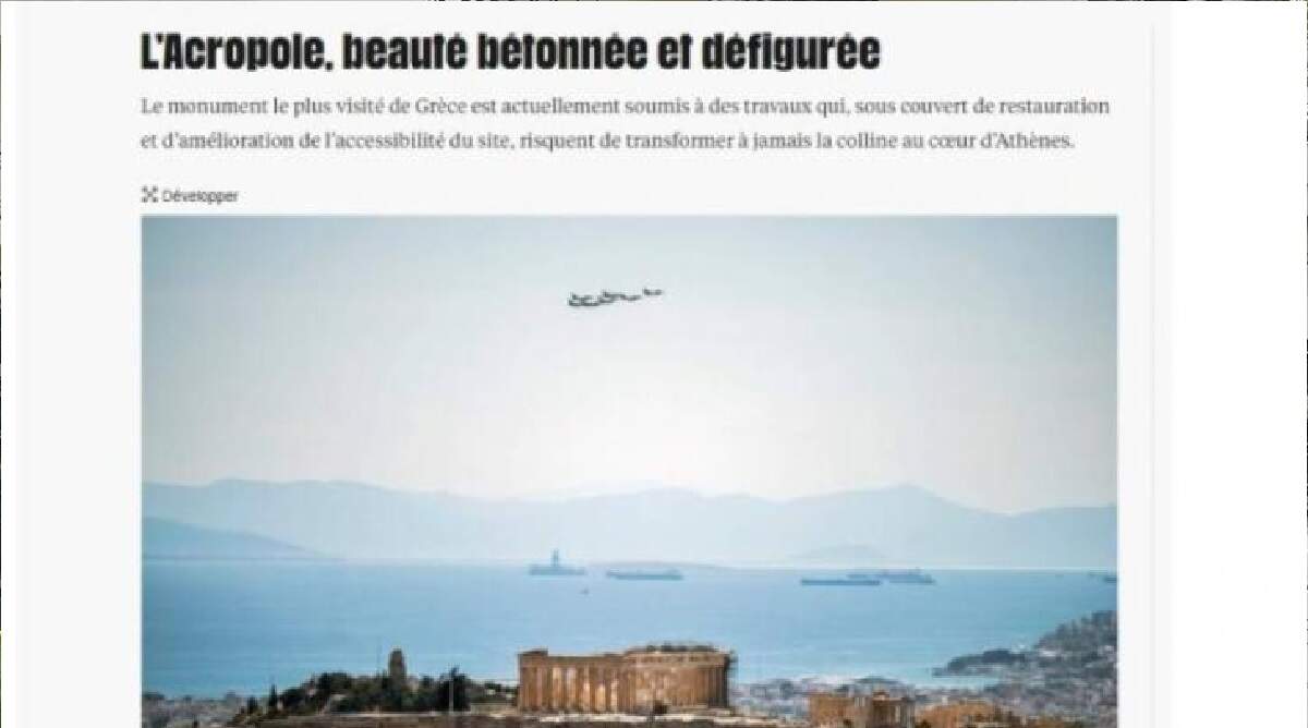 «Στο πιο επισκέψιμο μνημείο της Ελλάδας, επί του παρόντος πραγματοποιούνται εργασίες, με το πρόσχημα της αποκατάστασης και της βελτιωμένης προσβασιμότητας του χώρου, οι οποίες απειλούν να μεταμορφώσουν για πάντα στον λόφο στην καρδιά της Αθήνας» γράφει εισαγωγικά το ρεπορτάζ της Liberation.