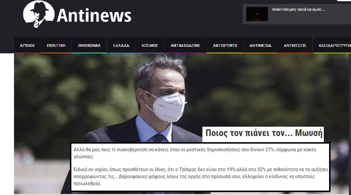 Μετά το ΕΥΡΩΒΑΡΟΜΕΤΡΟ Φεβρουαρίου – Μαρτίου, που κατέρριψε το success story του Μαξίμου και τις “δημοσκοπήσεις” των γνωστών εταιρειών που το στηρίζουν με νύχια και με δόντια (Το 71% των πολιτών δεν εμπιστεύεται την κυβέρνηση, το 77% πιστεύει πως τους επόμενους 12 μήνες θα είμαστε χειρότερα…) επανέρχεται και ο γνωστός δεξιός ιστότοπος antinews.gr με ένα νέο “χτύπημα” στην τεχνητή εικόνα παντοδυναμίας της ΝΔ και του Μητσοτάκη.