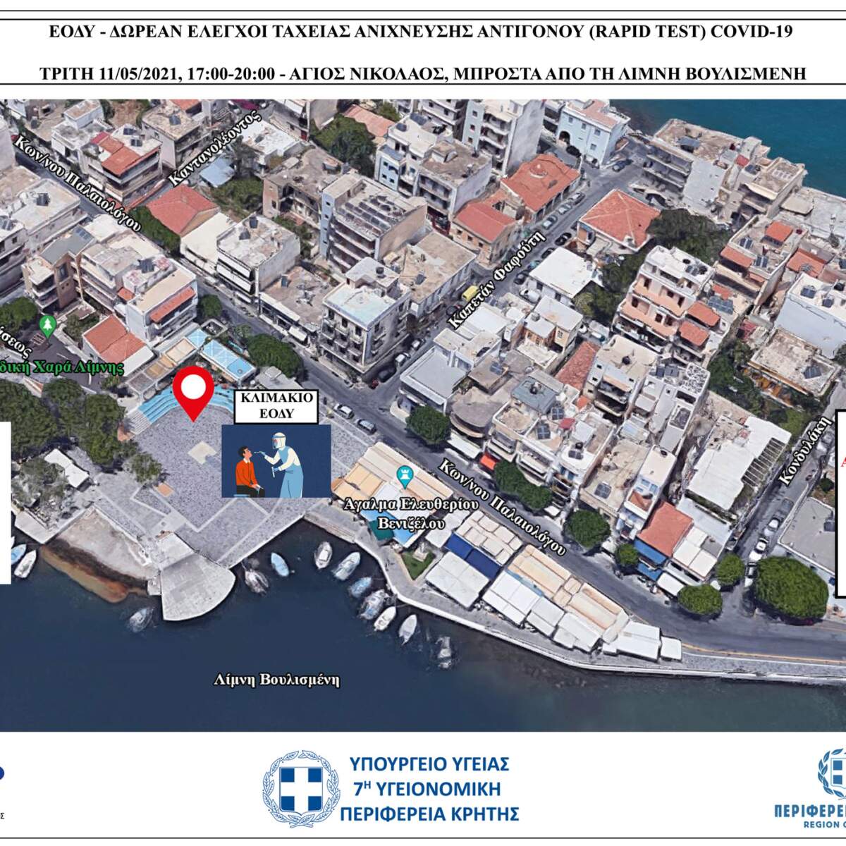 Έλεγχοι ταχείας ανίχνευσης αντιγόνου Covid-19 (rapid test) σε πεζούς θα πραγματοποιηθούν την Τρίτη 11/05/2021 από κλιμάκια του ΕΟΔΥ στον Άγιο Νικόλαο.