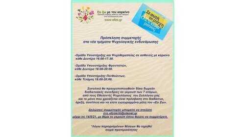 Ανακοίνωση του συλλόγου “Ευ Ζω με τον καρκίνο” για τις δωρεάν ομάδες ψυχολογικής υποστήριξης για ασθενείς και συγγενείς ασθενών
