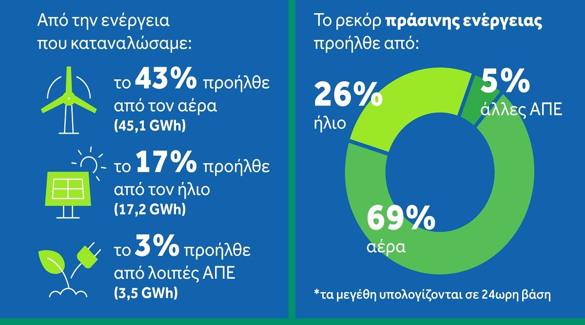 Η νέα ιστορική επίδοση της χώρας κατέρριψε το προηγούμενο ρεκόρ της 14ης Σεπτεμβρίου 2020 κατά 12 μονάδες, στέλνοντας ένα αισιόδοξο μήνυμα για την επιτυχία της ενεργειακής μετάβασης και την επίτευξη των εθνικών και ευρωπαϊκών στόχων για την Ενέργεια και το Κλίμα.