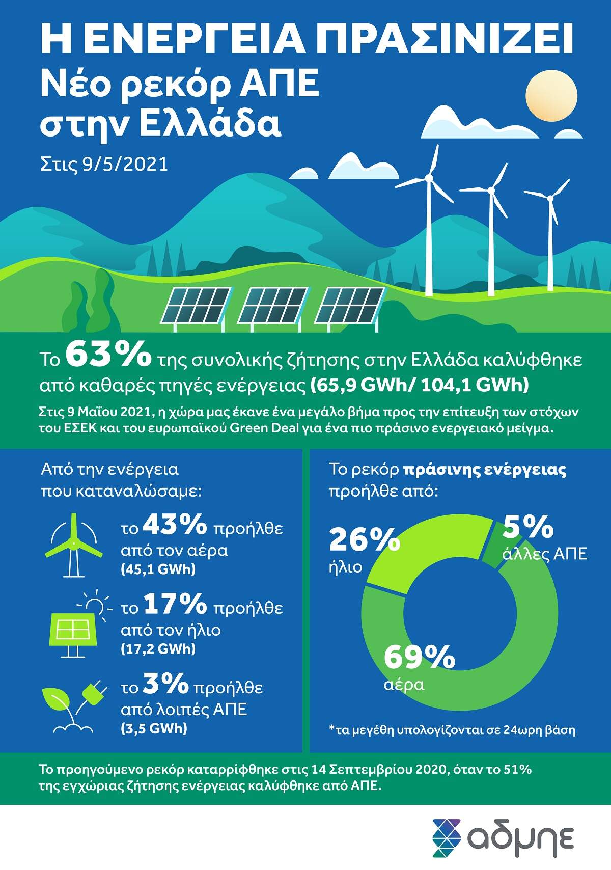 Νέο ρεκόρ καθαρής ενέργειας κατέγραψε η χώρα μας την Κυριακή 9 Μαΐου με τις ΑΠΕ να καλύπτουν το 63% της συνολικής ζήτησης (65,9 GWh/104,1GWh). Από την ενέργεια που καταναλώθηκε εκείνη την ημέρα, ο άνεμος «πρωταγωνίστησε» με 43%, ο ήλιος συνεισέφερε 17% και οι λοιπές ΑΠΕ (υδροηλεκτρικά, βιoαέριο-βιομάζα, ΣΗΘΥΑ) το υπολειπόμενο 3%.