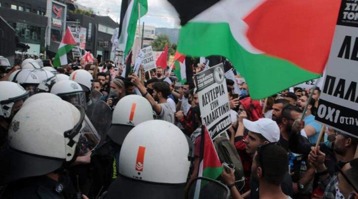 Πορεία πραγματοποιήθηκε, το απόγευμα του Σαββάτου, και στην Αθήνα προς την ισραηλινή πρεσβεία ως αλληλεγγύη προς το λαό της Παλαιστίνης για το αιματοκύλισμα των τελευταίων ημερών στη Μέση Ανατολή και την κλιμάκωση βίας ανάμεσα σε Ισραηλινούς και Παλαιστίνιους.