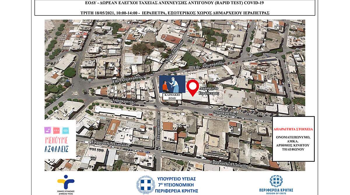 Έλεγχοι ταχείας ανίχνευσης αντιγόνου Covid-19 (rapid test) σε πεζούς θα πραγματοποιηθούν την Τρίτη 18/05/2021 από κλιμάκια του ΕΟΔΥ στην Ιεράπετρα.