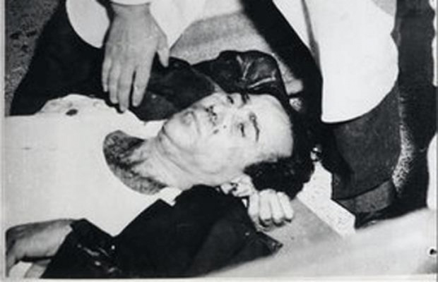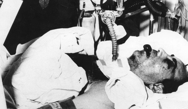 Η φωτογραφία που αναδημοσιεύουμε είχε δημοσιευτεί στην εφημερίδα «Μακεδονία», στις 25 Μαΐου, 2 ημέρες πριν εκπνεύσει ο Λαμπράκης. Στη λεζάντα η εφημερίδα σημείωνε: “Ο βουλευτής Λαμπράκης, επί της κλίνης, επί της οποίας διέρχεται τας τελευταίας του στιγμάς, χαροπαλαίων, εντός του υπ’ αριθ. 158 δωματίου του νοσοκομείου ΑΧΕΠΑ. Παρά το προσκέφαλον, η συσκευή δια της οποίας χορηγείται ανελλιπώς, μέσω της τραχειοτομής, το οξυγόνον εις τους πνεύμονας του τραγικού θύματος”.