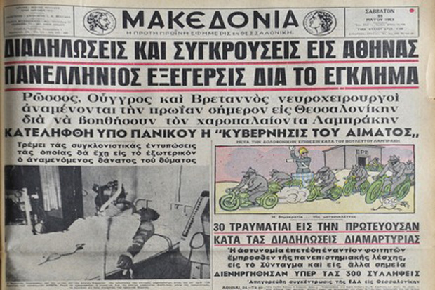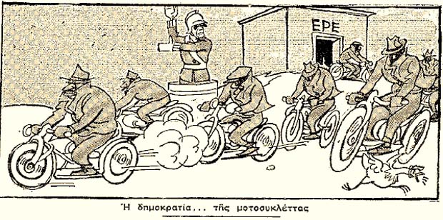 Η γελοιογραφία είχε δημοσιευτεί την ίδια ημέρα επίσης στο πρωτοσέλιδο της εφημερίδας «Μακεδονία». Στη δημιουργία του Φωκίωνα Δημητριάδη η ελληνική πολιτική πραγματικότητα περιγράφεται ως «δημοκρατία της μοτοσυκλέτας», με την ανοχή της κυβέρνησης. Άλλωστε ο τότε πρωθυπουργός Κωνσταντίνος Καραμανλής εμφανίζεται με τη μορφή τροχονόμου που δίνει την άδεια στους μοτοσυκλετιστές – παρακρατικούς να προχωρήσουν, αφού έχουν βγει από τα γραφεία του κόμματός του, δηλαδή της ΕΡΕ. Φυσικά η «μοτοσυκλέτα» συμβολίζει το παρακράτος και την τρομοκρατία αλλά και τη βία που χρησιμοποιούσε.