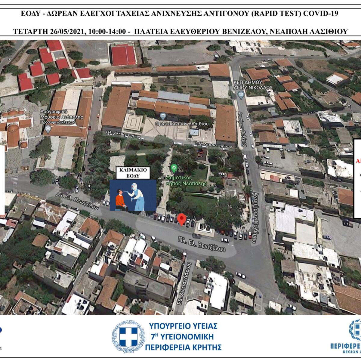 Έλεγχοι ταχείας ανίχνευσης αντιγόνου Covid-19 (rapid test) σε πεζούς θα πραγματοποιηθούν τη Τετάρτη 26/05/2021 από κλιμάκια του ΕΟΔΥ στη Νεάπολη Λασιθίου.
