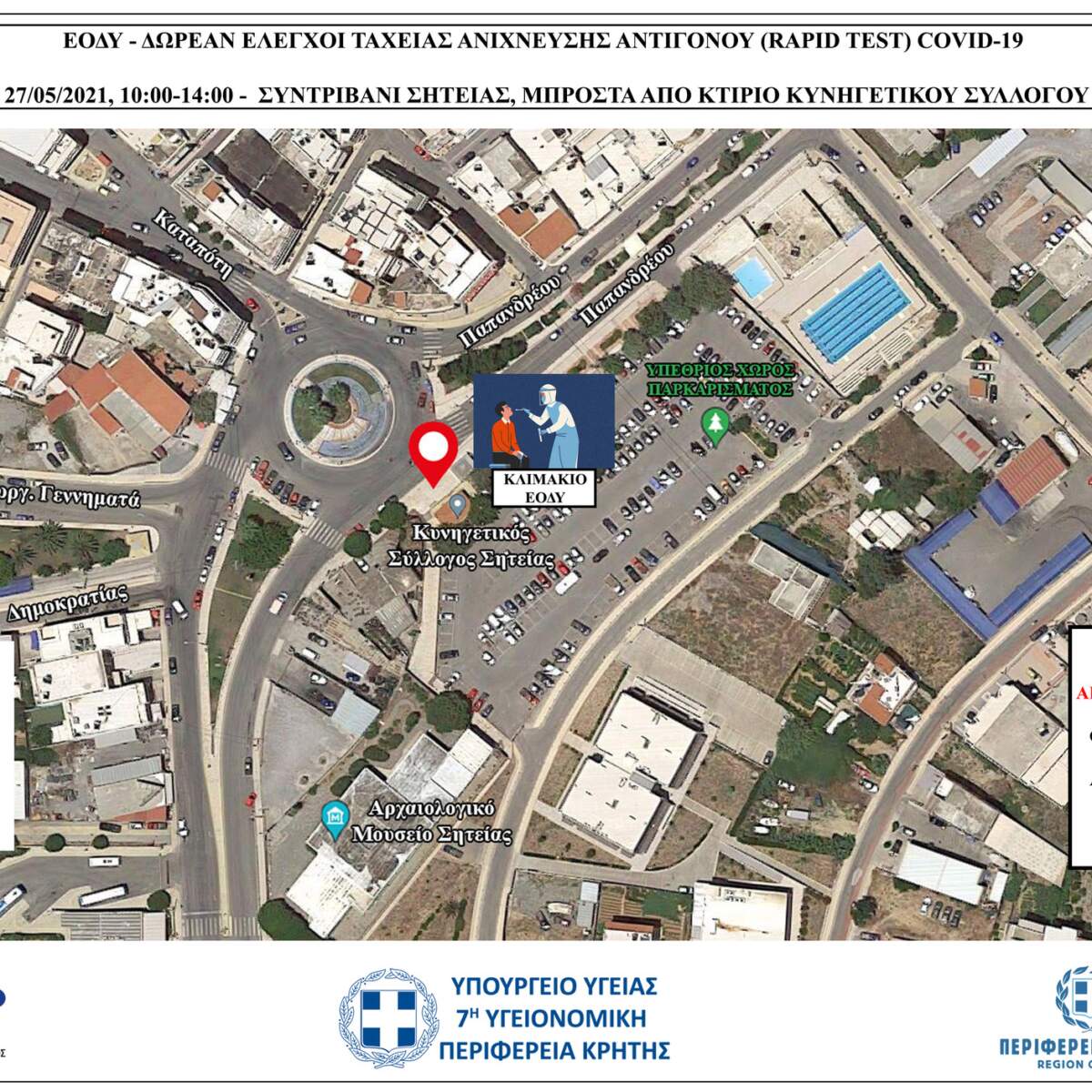 Έλεγχοι ταχείας ανίχνευσης αντιγόνου Covid-19 (rapid test) σε πεζούς θα πραγματοποιηθούν τη Πέμπτη 27/05/2021 από κλιμάκια του ΕΟΔΥ στη Σητεία.