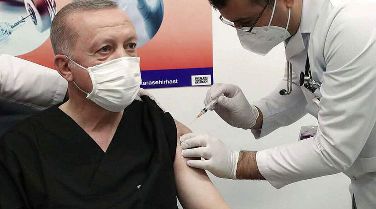 Ο Ερντογάν έκανε την πρώτη δόση του κινεζικού εμβολίου στις 14 Ιανουαρίου -και μάλιστα παρουσία τηλεοπτικού φακού, για να κατευνάσει τις ανησυχίες των πολιτών αναφορικά με την αποτελεσματικότητά του- και τη δεύτερη δόση στις 11 Φεβρουαρίου, ενώ παραμένει άγνωστο πότε έκανε, όπως λέει, την τρίτη δόση.