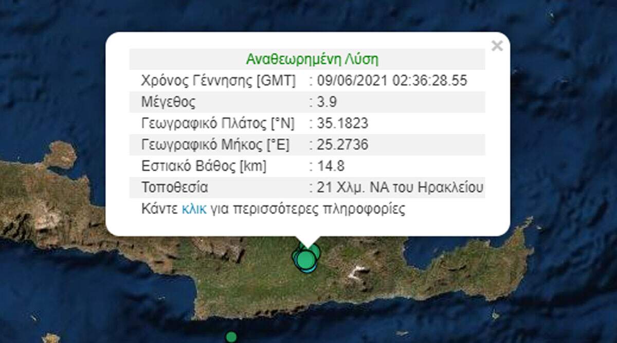 Νέα σεισμική δόνηση, αυτήν την φορά, έντασης 3,9 βαθμών της κλίμακας ρίχτερ σημειώθηκε τα ξημερώματα της Τετάρτης το Ηράκλειο.
