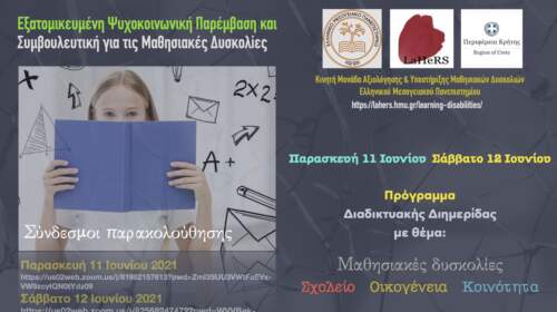 Διαδικτυακό Συνέδριο Συνέδριο του Προγράμματος “Εξατομικευμένη Ψυχοκοινωνική Παρέμβαση και Συμβουλευτική για τις Μαθησιακές Δυσκολίες στην Περιφέρεια Κρήτης”, θα διεξαχθεί διαδικτυακά στις 11 και 12 Ιουνίου 2021, υπό την επιστημονική ευθύνη του Εργαστηρίου Μελέτης Συμπεριφορών Υγείας και Οδικής Ασφάλειας (LaHeRS) του Ελληνικού Μεσογειακού Πανεπιστημίου και με την υποστήριξη της Περιφέρειας Κρήτης. Το συνέδριο απευθύνεται σε εκπαιδευτικούς όλων των βαθμίδων – γενικής…
