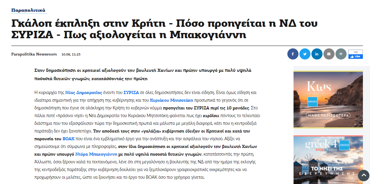 Διαβάζοντας όμως το κείμενο δεν παρουσιάζει καμιά δημοσκόπηση (ούτε στημένη δεν μπορούσε να δίνει “κεφάλι” στη ΝΔ στην Κρήτη και μάλιστα 10 μονάδες!), παρά μόνο ένα σχόλιο – ευχολόγιο βγαλμένο μέσα από την πετσολίστα, υπέρ ΝΔ και Μητσοτακέικου!