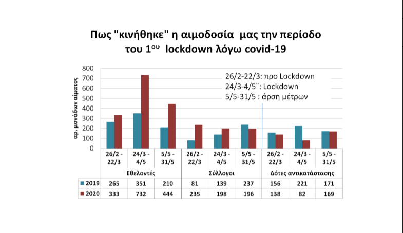 Στον τόπο μας ενώ όλα έκλεισαν η Αιμοδοσία «άνοιξε»: «Κάνε μια βόλτα με ουσία κι έλα στην Αιμοδοσία…», ήταν- εν μέσω της βαθιάς καραντίνας- το κάλεσμα μας, και οι συμπολίτες μας, είτε μεμονωμένα είτε μέσω δραστήριων συλλόγων, αντιστάθηκαν στο φόβο της πανδημίας και τον νίκησαν δωρίζοντας επανειλημμένα αίμα στις νέες δομές που αναπτύχθηκαν εκτός νοσοκομείου, στην Περιφέρεια ή στο Σταθμό Αιμοδοσίας στην πλατεία Ελευθερίας. Όπως φαίνεται και στο γράφημα ο εθελοντισμός μέσα στην καραντίνα αυξήθηκε περίπου κατά 20% και στην Αιμοδοσία του Πανεπιστημιακού Νοσοκομείου Ηρακλείου συλλέξαμε πάνω από 1000 μονάδες αίματος σε σύγκριση με τα προηγούμενα χρόνια. Ένα δε μέρος αυτών το στείλαμε στην Αθήνα και στη Θεσσαλονίκη, που σαν μεγάλα αστικά κέντρα, τα νοσοκομεία τους υπέφεραν από την έλλειψη αίματος περισσότερο από ότι εδώ την περιφέρεια.