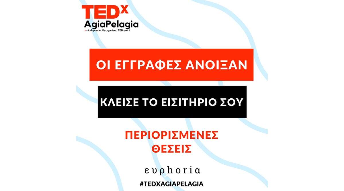 Το TEDxAgiaPelagia διοργανώνεται με την υποστήριξη του Δήμου Μαλεβιζίου, της ΜΑΕΔΗΜ και της Περιφέρειας Κρήτης και θα πραγματοποιηθεί το Σάββατο 24.07.2021 στην Αγία Πελαγία με θέμα «Ευφορία/Εuphoria».