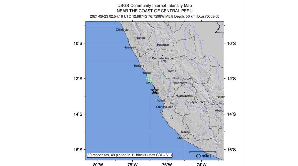 Η σεισμική δόνηση, η οποία το Κέντρο αρχικά είχε εκτιμήσει πως ήταν ισχύος 5,8 βαθμών, καταγράφηκε χθες Τρίτη στις 21:54 (τοπική ώρα· σήμερα Τετάρτη στις 05:54 ώρα Ελλάδας) και το επίκεντρό της εντοπίστηκε περίπου 100 χιλιόμετρα από τη Λίμα.