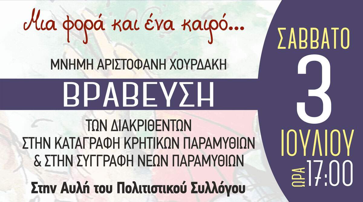 Με τη συνδιοργάνωση της Περιφέρειας Κρήτης, του Δήμου Μινώα Πεδιάδας, του Δ.Ο.Π.Α.Π και του Κέντρου Κρητικής Λογοτεχνίας, πραγματοποιείται εκδήλωση – βράβευση των διακριθέντων στην καταγραφή κρητικών παραμυθιών και στη συγγραφή νέων παραμυθιών στη μνήμη του Αριστοφάνη Χουρδάκη.
