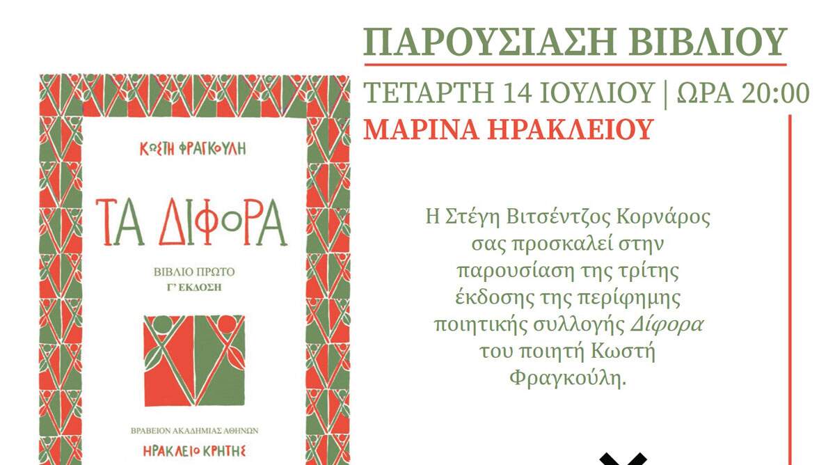 Η Στέγη Βιτσέντζος Κορνάρος σε συνεργασία με τους Δήμους Ηρακλείου και Σητείας συνδιοργανώνουν την παρουσίαση της τρίτης έκδοσης της περίφημης ποιητικής συλλογής Δίφορα του ποιητή Κωστή Φραγκούλη την Τετάρτη 14 Ιουλίου στις 08:00μ.μ. στο Καφέ Μαρίνα στο Ηράκλειο και την Πέμπτη 15 Ιουλίου στις 08:00μ.μ. στο Δημοτικό Κήπο Σητείας.