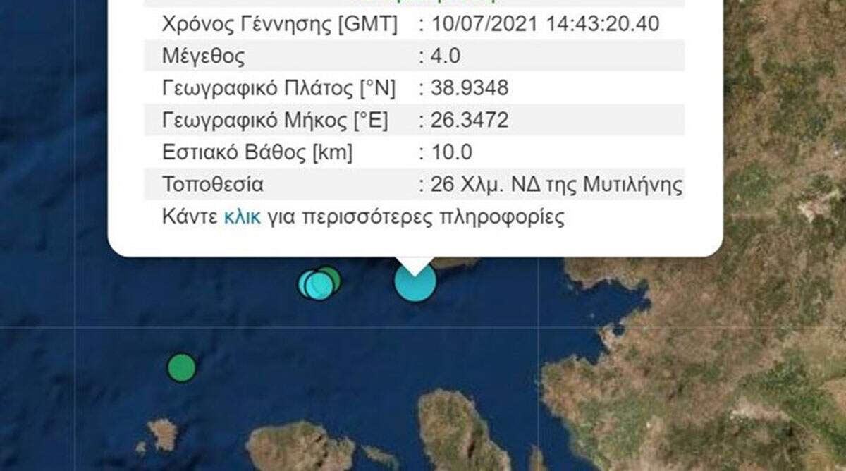 Σεισμική δόνηση σημειώθηκε πριν από λίγο στη θαλάσσια περιοχή Λέσβου. Σύμφωνα με την Αυτόματη Λύση του Γεωδυναμικού Ινστιτούτου Αθηνών ο σεισμός είχε μέγεθος 4 Ρίχτερ. Το επίκεντρο εντοπίζεται 26 χιλιόμετρα νοτιοδυτικά της Μυτιλήνης και το εστιακό βάθος υπολογίζεται στα 10 χιλιόμετρα.