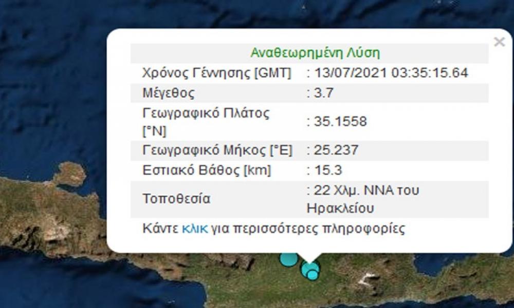 Σεισμική δόνηση μεγέθους 3,7 βαθμών της κλίμακας Ρίχτερ σημειώθηκε στις 06:35 τα ξημερώματα της Τρίτης στην Κρήτη.
