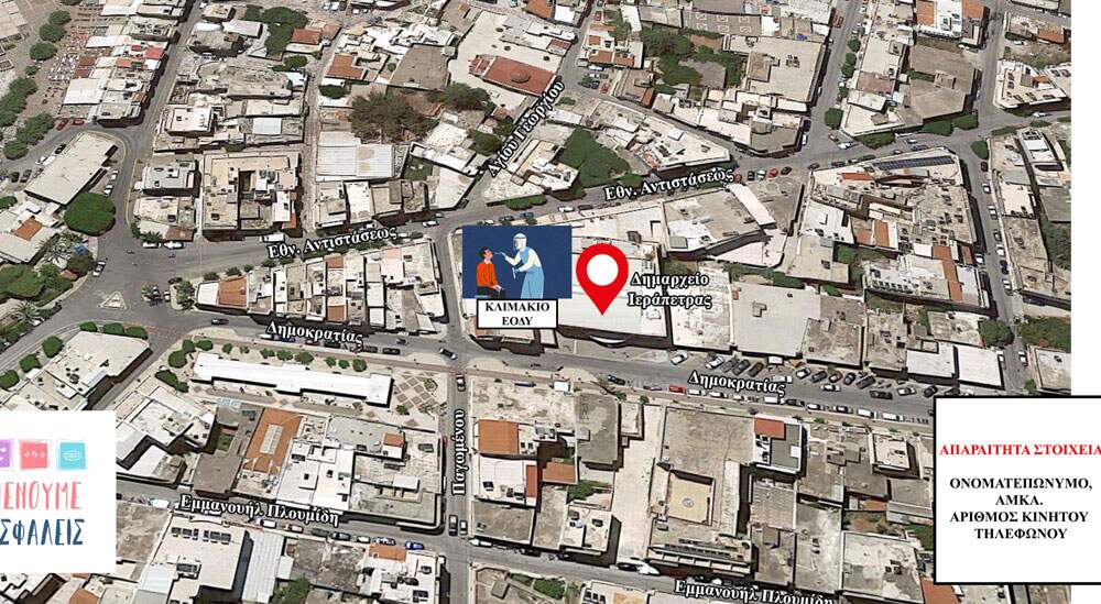 Οι δειγματοληψίες θα διεξαχθούν στον εξωτερικό χώρο του Δημαρχείου Ιεράπετρας από τις 10:00 έως τις 14:00, όπως απεικονίζεται στον χάρτη.