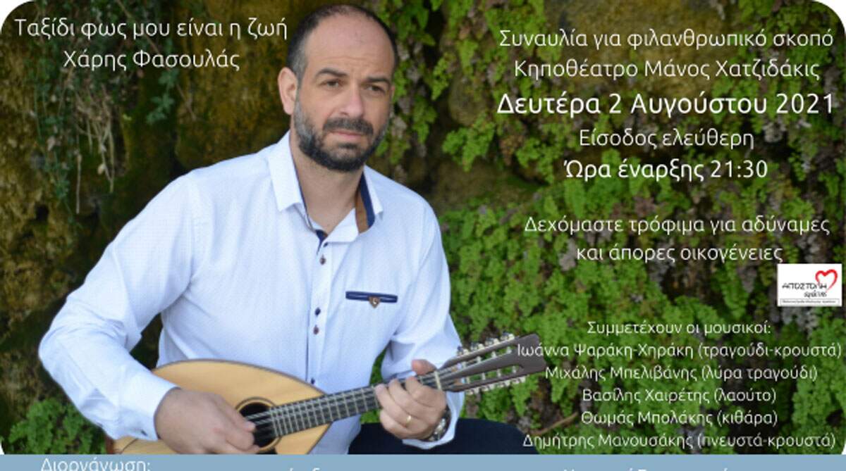Με τη διοργάνωση της Περιφέρειας Κρήτης πραγματοποιείται συναυλία με φιλανθρωπικό σκοπό με τίτλο: «Ταξίδι φως μου είναι η ζωή» με το Χάρη Φασουλά, τη Δευτέρα 2 Αυγούστου στο Κηποθέατρο Μάνος Χατζιδάκις στο Ηράκλειο στις 21.30.