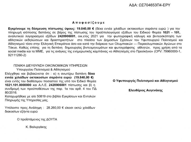 «Εγκρίνουμε τη δέσμευση πίστωσης ύψους: 19.840,00 € (δέκα εννέα χιλιάδων οκτακοσίων σαράντα ευρώ ) για την πληρωμή ισόποσης δαπάνης σε βάρος της πίστωσης του προϋπολογισμού εξόδων του Ειδικού Φορέα 1021 – 101, αναλυτικού λογαριασμού εξόδων 2420906001, οικ. ετος 2021 για την φωτογραφική κάλυψη και βιντεοσκόπηση των αθλητικών εκδηλώσεων και δραστηριοτήτων στο πλαίσιο των Δημοσίων Σχέσεων του Υφυπουργού Πολιτισμού και Αθλητισμού τόσο στην Ελληνική Επικράτεια όσο και κατά την διάρκεια των Ολυμπιακών — Παραολυμπιακών Αγώνων στο Τόκιο. Καθώς επίσης για τη δαπάνη δημιουργίας βιντεομηνυμάτων και φωτογράφισης αθλητών, προς χρήση από τα social media και τα ΜΜΕ, για τις ανάγκες της ενημερωτικής καμπάνιας «ο Αθλητισμός στο Προσκήνιο».