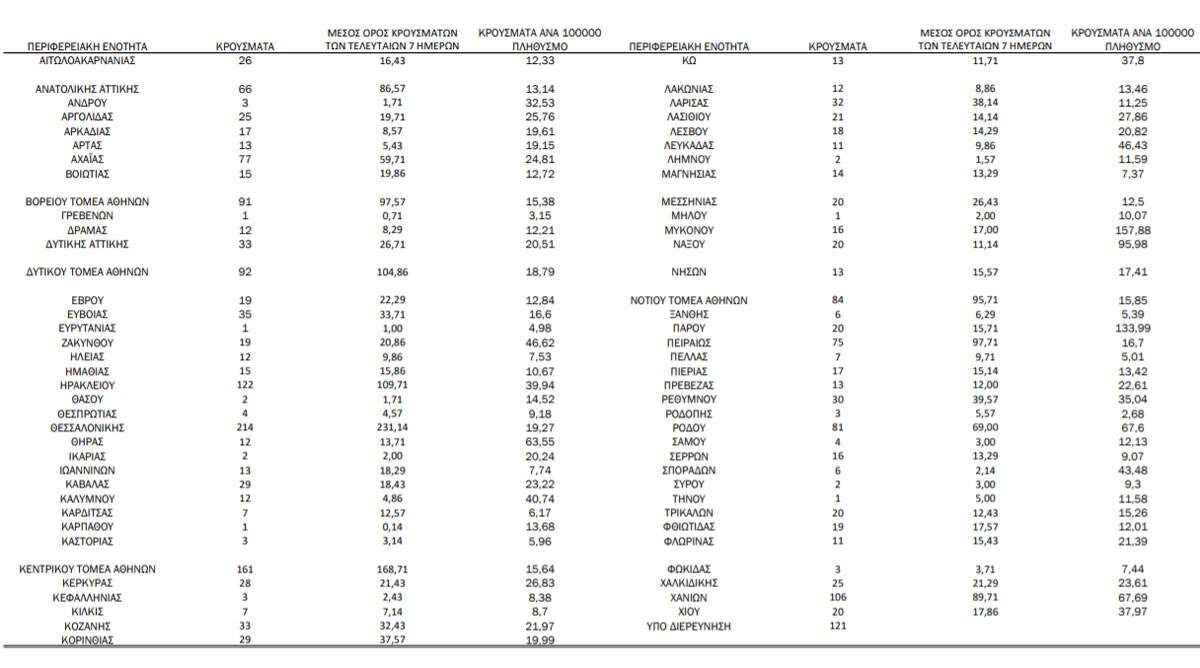 Με βάση τα επιβεβαιωμένα κρούσματα των τελευταίων 7 ημερών, 155 θεωρούνται σχετιζόμενα με ταξίδι από το εξωτερικό και 1.687 είναι σχετιζόμενα με ήδη γνωστό κρούσμα.