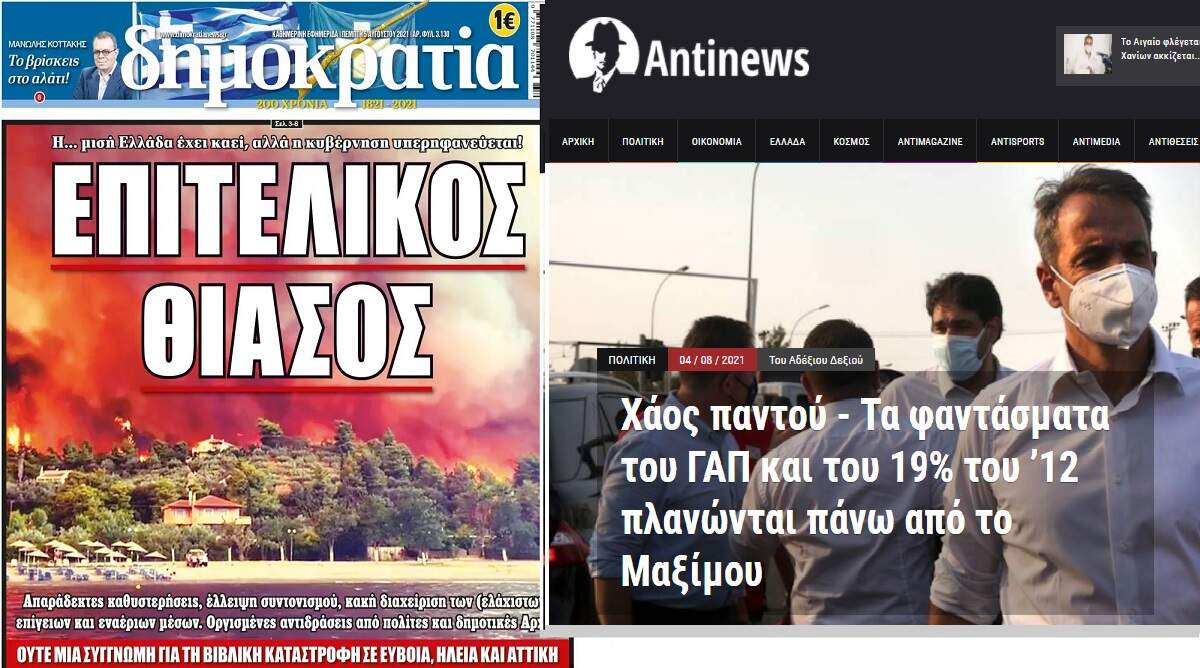 Το επιτελικό μπάχαλο της κυβέρνησης Μητσοτάκη, με αφορμή και τις πυρκαγιές που καίνε την Ελλάδα με άπνοια, καταγγέλλουν με κεντρικά τους θέματα μέσα ενημέρωσης που ανήκουν στον χώρο της δεξιάς.