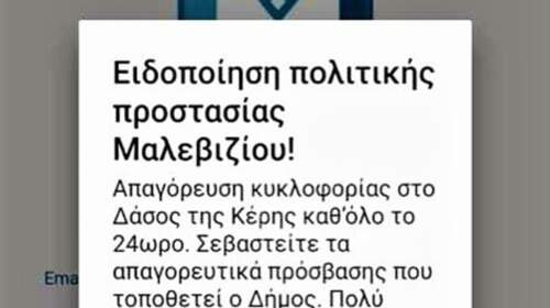 Λόγω αυξημένου κινδύνου πρόκλησης πυρκαγιάς Μήνυμα στα κινητά τηλέφωνα έλαβαν πολίτες στο Δήμο Μαλεβιζίου μέσω της εφαρμογής Δημότης Μαλεβιζίου, από το τμήμα Πολιτικής Προστασίας του Δήμου, λόγω του αυξημένου κινδύνου πρόκλησης πυρκαγιάς. Οι πολίτες ενημερώθηκαν για την απαγόρευση κυκλοφορίας στο δάσος της Κέρης ενώ παράλληλα τους ζητήθηκε να είναι προσεκτικοί και να αποφύγουν οποιαδήποτε ενέργεια που θα μπορούσε να προκληθεί…