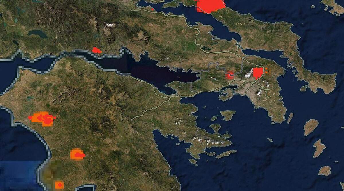 Σοκάρει η εικόνα με τα φλεγόμενα μέτωπα στην Ελλάδα, όπως μεταδίδεται σε πραγματικό χρόνο στην υπηρεσία FIRMS (Fire Information for Resource Management System) της NASA.