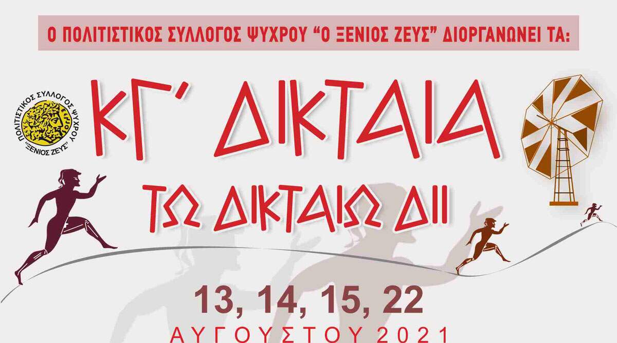 Με τη συνδιοργάνωση της Περιφέρειας Κρήτης, ο Πολιτιστικός Σύλλογος Ψυχρού «o Ξένιος Ζευς» διοργανώνει τα ΚΓ΄ΔΙΚΤΑΙΑ 2021, την Παρασκευή 13 Αυγούστου 2021 έως και την Κυριακή 15 Αυγούστου 2021 και τους 40ους ΔΙΚΤΑΙΟΥΣ ΑΓΩΝΕΣ, την Κυριακή 22 Αυγούστου 2021 στο Οροπέδιο Λασιθίου. Οι εκδηλώσεις πραγματοποιούνται και με τη συνδιοργάνωση του Δήμου Οροπεδίου Λασιθίου. Το πρόγραμμα περιλαμβάνει: