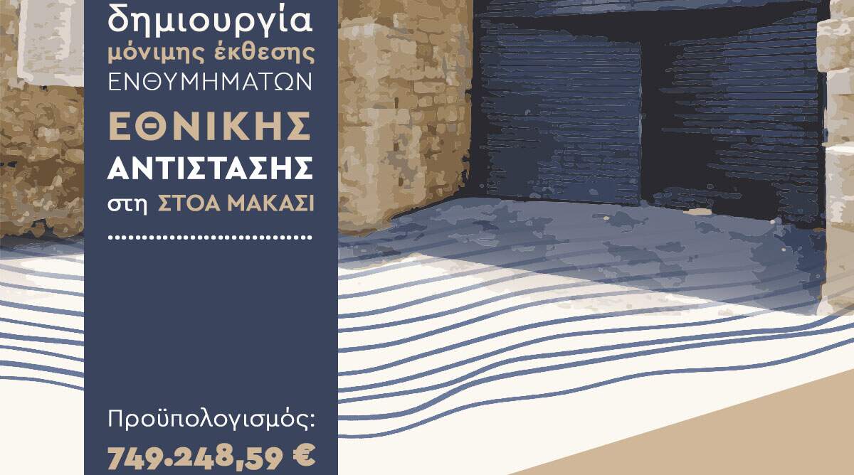 Ο Περιφερειάρχης Κρήτης Σταύρος Αρναουτάκης υπέγραψε την ένταξη του έργου «ΔΗΜΙΟΥΡΓΙΑ ΜΟΝΙΜΗΣ ΈΚΘΕΣΗΣ ΕΝΘΥΜΗΜΑΤΩΝ ΕΘΝΙΚΗΣ ΑΝΤΙΣΤΑΣΗΣ ΣΤΗ ΣΤΟΑ ΜΑΚΑΣΙ στο ΠΕΠ Κρήτης 2014 -2020» με προϋπολογισμό 749.248,59 € και συγχρηματοδοτείται από το Ευρωπαϊκό Ταμείο Περιφερειακής Ανάπτυξης και Εθνικούς Πόρους.